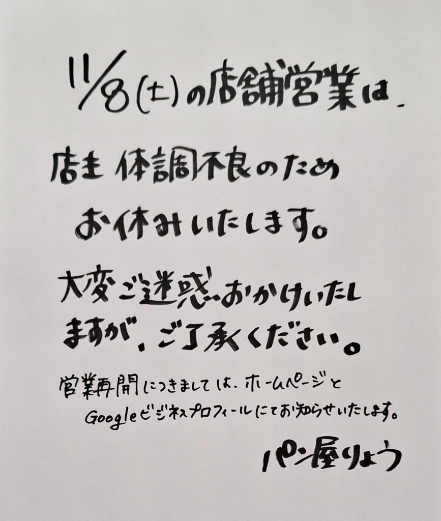 11月8日(土)は、お休みします 投稿日 2025年11月7日 著者 パン屋りょう カテゴリー お知らせ カテゴリー 新着情報 チカコです。申し訳ございません。明日 11月8日(土)は、夫の体調不良のためお休みいただきます。 最近、また鬱病がひどくなり、昨日の仕込みまでは耐えていましたが、今日は立ち上がれずの状態です。本人は、明後日 11月9日(日)に営業再開したいと言ってますが、営業再開は、またホームページでお知らせいたします。 ご来店予定のお客様には大変ご迷惑おかけいたします。どうぞご理解のほどお願いいたします。 関連