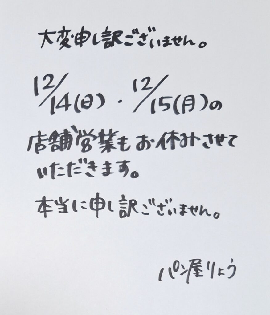 12月14日(日)、12月15日(月)の営業について 投稿日 2025年12月13日 著者 パン屋りょう カテゴリー お知らせ カテゴリー 新着情報 12月14日(日)・12月15日(月)の店舗営業もお休みさせていただきます。 心待ちにしてくださっているお客様方には、大変なご迷惑をお掛けいたしており、本当に申し訳ございません。 関連