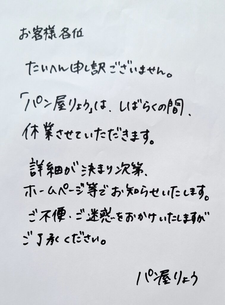 大変申し訳ございません 投稿日 2025年12月19日 著者 パン屋りょう カテゴリー お知らせ カテゴリー 新着情報 主人の体調が戻らず、お店を開けれない状態が続いておりますので、『パン屋りょう』はしばらくの間、休業させていただきます。 お客様には多大なるご不便・ご迷惑をお掛けいたしており、本当に申し訳なく思っております。 詳細が決まり次第、ホームページ等でお知らせいたします。 関連